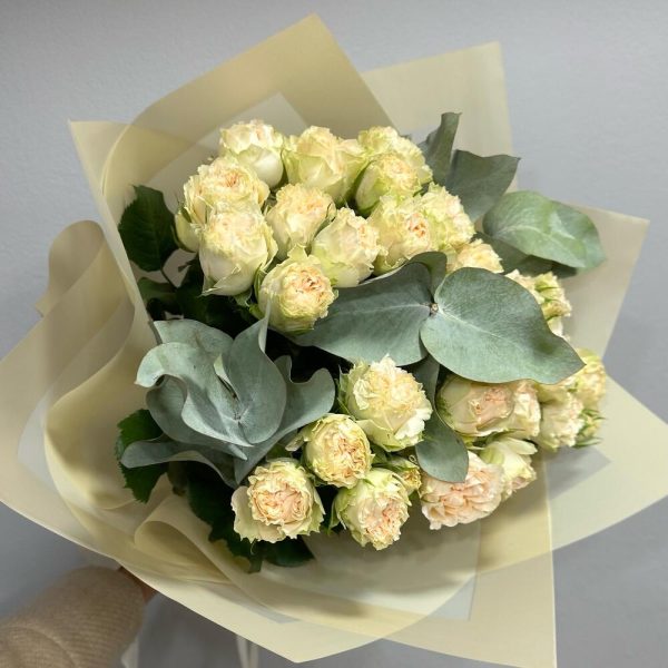Кремовый ажурный букет Пионовидных кустовых роз – просто услада для глаз. Нежный и фактурный !